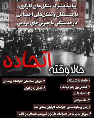تداوم قاطعانهٔ اعتراضات، گسترش اعتصابات، هوشیاری و اتحاد، ضامن پیشروی ما و تحقق آرزوهای سرکوبشدهمان است. راهی را که انتخاب کردیم با قدرت ادامه میدهیم و با اتحاد و همبستگی خود به این بردگی، فقر، خفت و نابرابری پایان خواهیم داد.