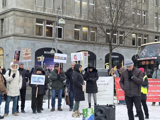 آن ها با دادن شعارهائی مختلف از جمله ـ جمهوری سکولار، دمکراسی پایدارـ جمهوری اسلامی نمیخواهیم ـ ،زن، زندگی، ازادی ـ مرگ بر جمهوری اسلامی ـ آزادی برای ایران ـ نه به اعدام ـ آزادی همه رندانیان سیاسی ـ دمکراسی برای ایران ـ همبستگی بین المللی و ... به زبان های المانی و فارسی با مردم ستم دیده ایران و خانواده های جانباخته اعلام همبستگی کردند. همچنین با خواندن قطعنامه ای ضمن تاکید بر خواست های بالا، مخالفت خود را با دخالت نظامی اعلام کردند.