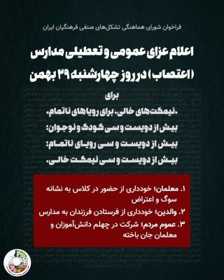 فردا چهارشنبە ٢٩ بهمن از سوی دە ها تشکل دانشجویی و شورای هماهنگی تشکلهای صنفی در دو بیانیە مجزا بمناسبت چهلمین روز کشتە شدگان در جریان جنبش انقلابی دی ماە دعوت بە اعتصاب عمومی شدە است. جریانات زیادی از این فراخوانها حمایت نمودە و همبستگی و همراهی خود را با آن اعلام کردەاند. این اعتصاب امروز عملا با اعتراضات گستردەای کە در آرامستان های چندین شهر شکل گرفت شروع شدە است. حضور مردم برابر گزارشات تصویری تا کنون منتشر شدە، در این شهرها آنقدر گستردە بود کە نیروهای سرکوبگر موفق بە جلوگیری از شرکت پرشمار مردم و بر هم زدن تجمع های آنان نشدند.