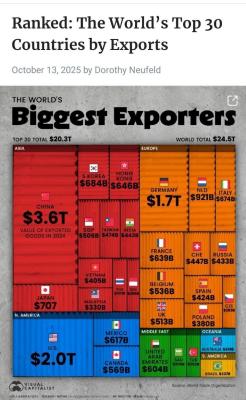 طبق دادههای سازمان تجارت جهانی در 2024 چین با سهم 14.6درصدی از کل صادرات جهانی، بزرگترین صادرکننده دنیا بود.