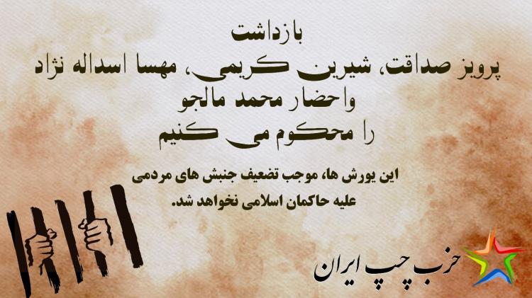 سهشنبه, 4. نوامبر 2025 - 02:06 بازداشت پرویز صداقت،شیرین کریمی و مهسا اسداله نژاد را محکوم میکنیم بازداشت پرویز صداقت،شیرین کریمی،مهسا اسداله نژاد و احضار محمد مالجو را محکوم میکنیماین یورشها، موجب تضعیف جنبش های مردمی علیه رژیم اسلامی نخواهد شد اطلاعیهها و فراخوانها چاپ