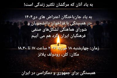 ما نیز به سهم خود، در حمایت از این فراخوان و با گرامی داشت یاد و نام جان باختگان اعتراض های اخیر در روزهای سه شنبه و چهار شنبه ۱۷ و ۱۸ فوریه، در میدان های اصلی شهر های مختلف جهان گرد هم می آییم و هم صدا و در حمایت از فراخوان دانشجویان و همه ی کسانی که به این اعتصاب پیوستند، صدای مردم ایران خواهیم شد.